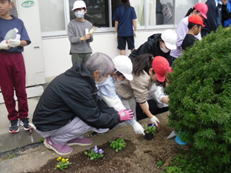 | 緑化活動(花植え) 秋と冬に花を咲かせるパンジーとビオラの苗植えをなかよし班(縦割り)のグループに分かれて行いました。今年度も地域ボランティアの方にも協力をいただきながら友達と仲良く植えました。5・6年生を中心に互いに声を掛け合いながら、楽しく花を植える子供たちの声が聞こえてきました。登校時や校庭で遊ぶときに必ず目にする花壇が色とりどりの花でいっぱいになり、大変良い気持ちとなりました。今後の水やりでも互いに協力し合い、きれいな学校を保つことができればいいなと思います。 |
