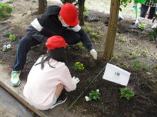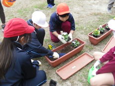 | 緑化活動(花植え) 秋と冬に花を咲かせるパンジーとビオラの栽培をなかよし班(縦割り)のグループに分かれて行いました。今回は、地域ボランティアの方にも協力をいただきながら友達と仲良く植えました。6年生のリーダーの話を最後まで聞き、楽しく花を植える子供たちの声が聞こえてきました。登校時や校庭で遊ぶときに必ず目に付く花壇が色とりどりの花でいっぱいになり、大変良い気持ちになりました。まだ、咲いていない花もあり、何色の花が咲くのか楽しみです。 |