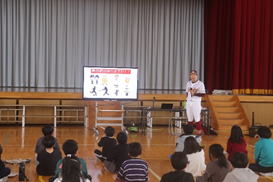 | 夏休み前全校集会 業間に,夏休み前全校集会を行いました。 校長の話(教頭代読)では,夏休み中も三つの「あ」を心掛けて生活することや,安全で充実した夏休みにするための約束を子どもたちに伝えました。代表児童の発表では,2年1組 角田楓馬さんが,2年生になってから頑張ってきたことや夏休みに楽しみにしていることを,堂々と伝えました。 また,集会後には,スポーツ少年団で優秀な成績を収めた児童の表彰を行いました。詳しくは,夏休み明け最初の学校便りに掲載しますので,ぜひ御覧ください。さらに,生徒指導主任から,安全な夏休みにするために大切なことを話しました。 今日確認したことをしっかり守り,よい夏休みにしてほしいと思います。 |