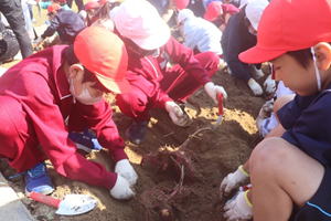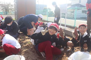 | さつまいも収穫 10月31日(木)、6月に植えたさつまいもを収穫しました。土を掘り進めると、顔を出してきたさつまいもに子供たちは大興奮です。縦割り班の友達と力を合わせ、体操着が汚れるくらい一生懸命掘り続け、さつまいもが土から抜けたときはとても喜んでいました。顔よりも大きいさつまいもがたくさん出てくるなど、今年も大豊作です。さつまいもはしばらく乾燥させてから全児童に配付します。 |