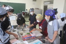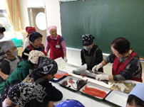 | 5年生はらこめしづくり 荒浜小学校では、5年生の総合的な学習の時間で、郷土について学ぶ一環としてはらこめしづくりを行っています。今年も「亘理食育の輪」の皆様に御指導と御協力をいただきました。話を真剣に聞き、グループの友達と協力して、おいしいはらこめしをつくることができました。「自分で作ったものはおいしいな。」「鮭の解体がすごかった。」「優しく丁寧に教えてくださったおかげで上手に作ることができた。」など、喜びと感謝の言葉がたくさん聞かれる活動となりました。 |