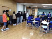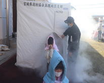 | 火災対応訓練 火災によって起こる危険を学び、迅速かつ安全に避難行動ができるようになるために、火災対応訓練を実施しました。消火器を用いての消火訓練を通して、消火器の正しい使用方法を理解しました。煙幕通過体験では、ハンカチで口を覆うことや、落ち着いて行動することの大切さを学ぶことができました。 |